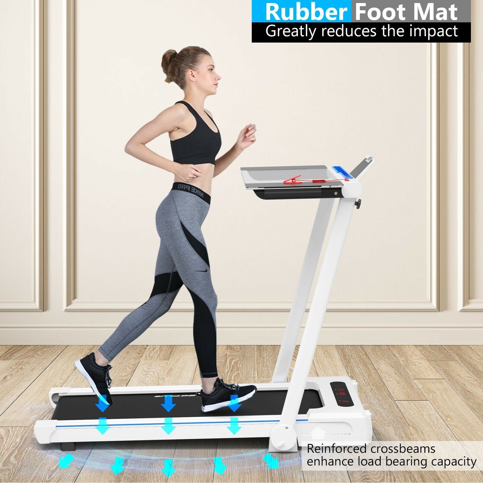 3 in 1 design and removable tabletop is perfect for working; jogging; runningPowerful 2.25 hp quiet motor significantly enhance sports effectConnect the treadmill to your phone through Bluetooth to enjoy musicBuilt-in flexible transport wheels make it easy to move and storeSafety key is used for emergency braking and can avoid safe accidents5-layer shock-absorbing running belt reduces impact during sportsPhone holder helps you to enjoy movies while runningA large and detachable table is used to place computers or other materials16'' widened running belt allows you to run freelyRubber foot pads greatly reduce the impactLCD display screen helps to monitor speed; distance; time; step and calories in real-timeIncluded remote control is convenient to adjust the speed from 0.5Mph-7.5Mph