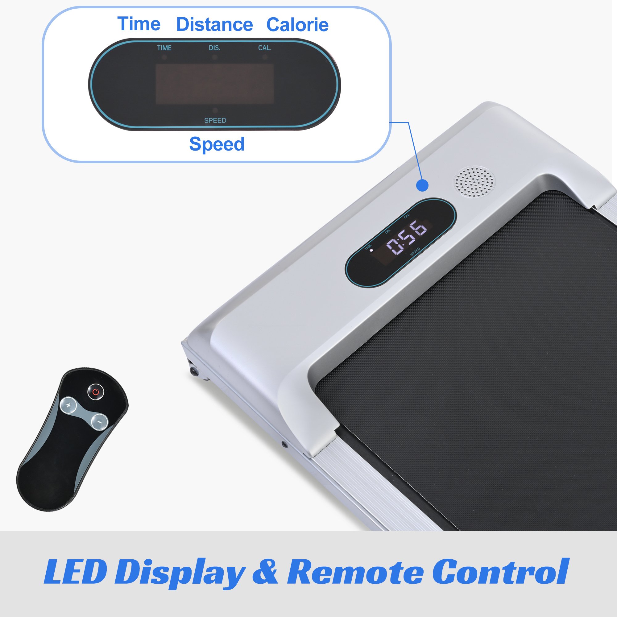 2 in 1 Under Desk Treadmill. The independent remote control can efficiently control and adjust the running speed and improve the running safety. Available in 0.5 to 4 MPH Speed levels, this walking treadmill allow you to select different speed base on your physical condition and exercise based. Maximum weight: 265lbs.With a 2.5 HP powerful quiet Motor,the electric treadmill is perfect for running, jogging, and walking in the comfort of your home. With a durable steel frame and multi-layer shield design, the under desk treadmill's shock-absorbing and noise-reducing, making your running quieter, safer and more comfortable.The LED display clearly shows time, calories, step, speed and distance, monitoring your progress in real time and keeping your movement data at a glance.No Assemble & Space-saving: Unlike the traditional treadmills, our walking and running 2 in 1 treadmill is no assemble needed, designed to be lightweight, portable and easy to store under the bed or desk. Wheels at the bottom are for easy transportation.39.37"x 14.96" Widened Running Belt Making running or walking on this treadmill more freely. 5 layers non-slip running belt and Silica gel column support will greatly absorb shock to provide cushioning for knee, muscle and joints.