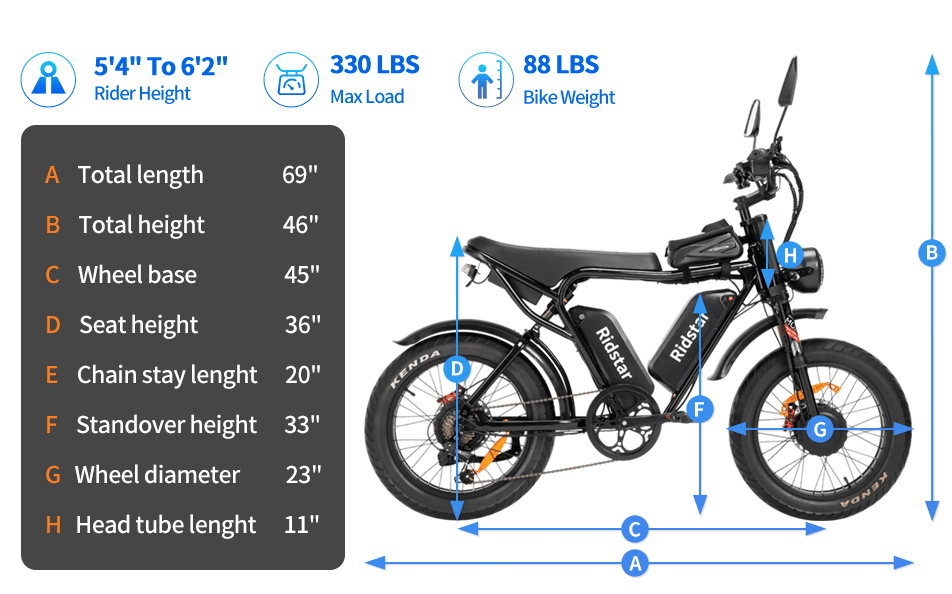 5.A: total length 69 inches B: Overall height 46 inches C: Wheelbase 45" D: Seat height 36" E: Transverse triangle length 20" F: Cross-section height 33" G: Wheel diameter 23" H: Head tube length 11"