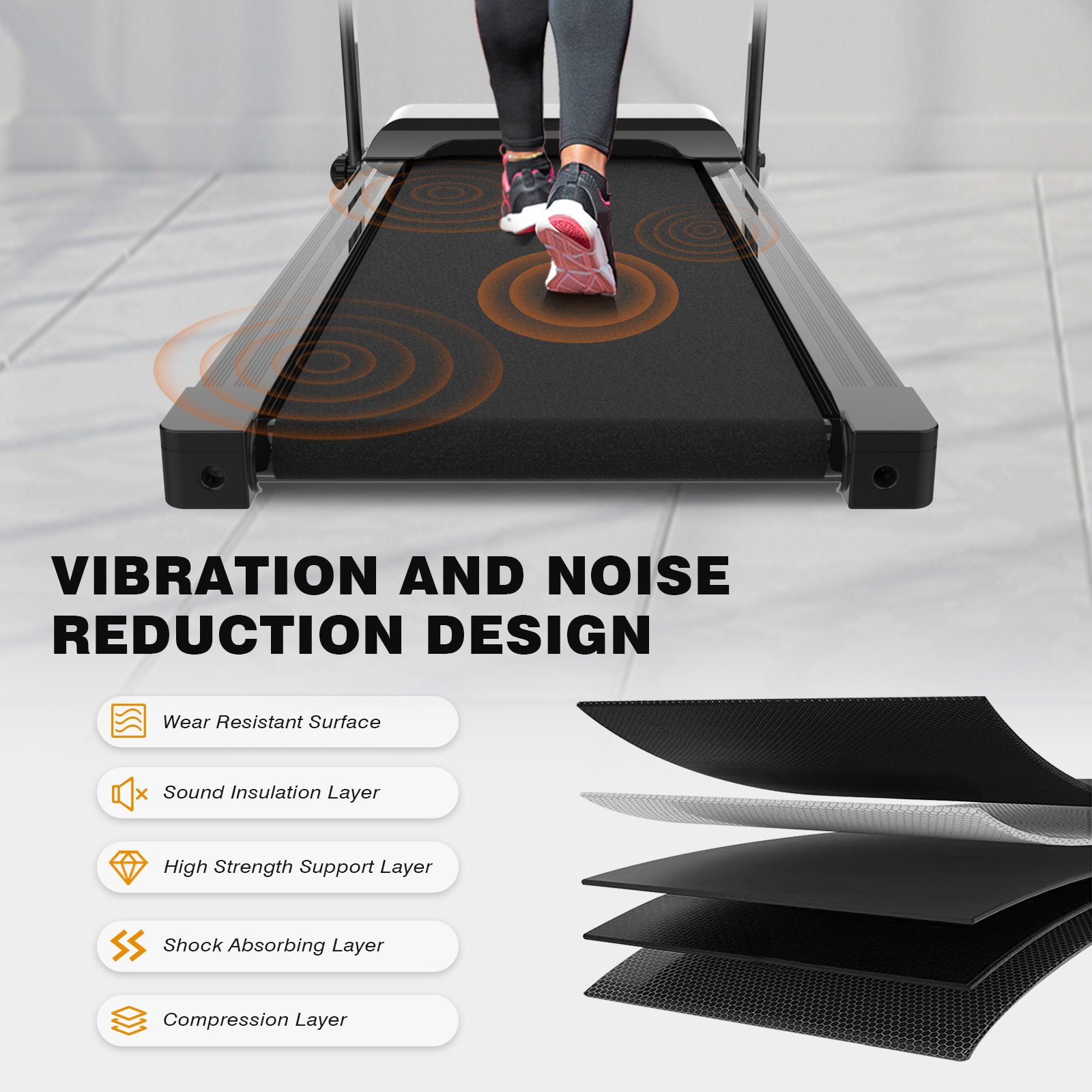 2.[COMFORTABLE RUNNING EXPERIENCE]: The running belt (14.96''x41.33 '') of the treadmill for home is made of 5-layer non-slip textured material, extremely flexible and comfortable. 2 rubbers and 6 latex of the foldable treadmill form the scientific shock absorper system so as to provide maximum protection to joints and ankles. 2.5HP motor provides quiet moreover stable operation, offering speeds of 0.5-7.5 MPH and 220lb weight capacity, suitable for most people.