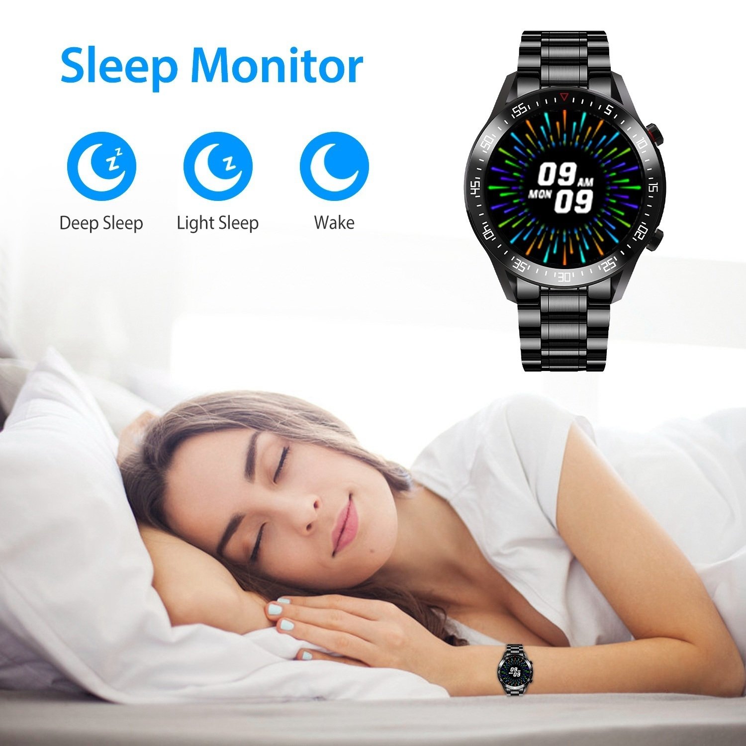 *Care For Your Health*:Automatically monitor your real-time heart rate; and provide comprehensive analysis of your sleep quality(deep sleep; light sleep and wake up time) to develop a healthier lifestyle. Can also measure your blood oxygen value; blood pressure value and you can view more detailed information analysis and data record in app.