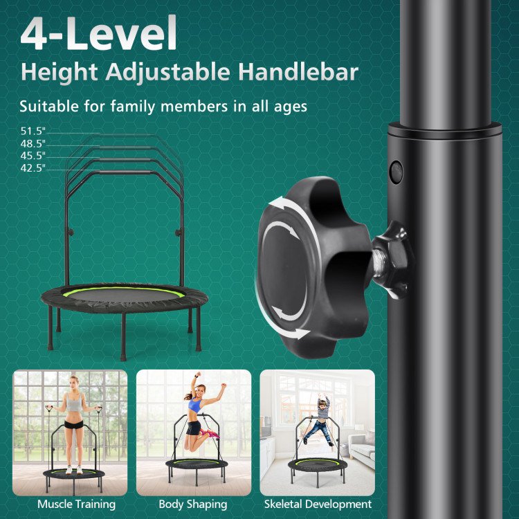 2.Height Adjustable Foam Handrail: The bouncer has 3 different handrail heights to choose from, ranging from 43" to 51". Adults and kids can adjust the handrail to different heights according to their needs to get a better bounce experience. Covered by foam material, the handrail is comfortable and easy to grip.